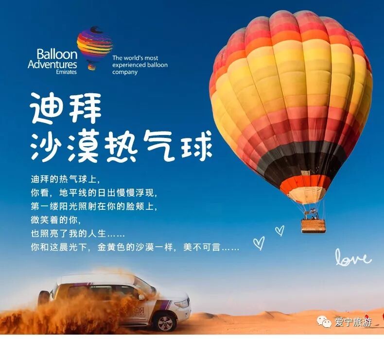 但是如果你来过迪拜的沙漠,保证你会用“浪漫”,“刺激”来形容!10月6日,爱宁旅行社将携手和你相遇在迪拜热气球,你还在等什么?快来体验吧!